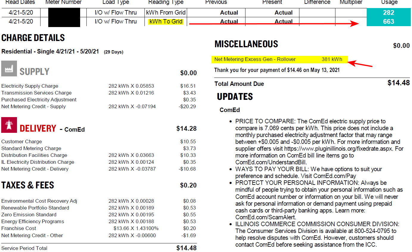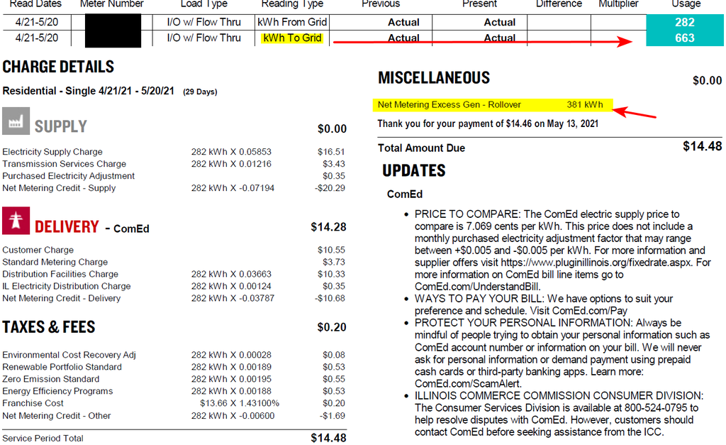 so this has been my costs for the last year with comed There is a cost for just being connected to the electric company.. Last year it was like 16$, but looks like it has gone down to like 14.50ish this year.. Some sort of credit? So for example here is my bill from last month You can see how much I sent to the grid, and how much I pulled from the grid... Since I sent way more than I used this month. That sits in my account, rolled over - so if I do not produce as much as I use next month I have that many kwh saved up to pay for what I used in the month(s) I do not produce as much as I use. I don't have a battery so always pull from grid at night. And if cloudy, rainy, snow etc.. and not producing as much as using then yes it pulls from the grid. As I mentioned in a previous post - in the first year I saved a few hundred from the year before.. If you add up total cost of solar and what paid electric company. Now time will only tell if was a good choice for the long run, since I didn't buy my system I leased it. Not your best choice for most bang for your buck economically that is for sure, but it was zero out of pocket cost.. I saw it as just locking into a specific cost for electricity, for the time of the lease. So from my point of view I hope electric costs go way up so will be saving more money. And not have to worry about any cost for repairs if something breaks.. But I am happy with choice so far - now will I still be happy in a few years? Not sure - if electric costs drop into the dirt then might not be a good choice.. But the system running is not my problem, so don't have to worry about that. And if doesn't produce what they say it should produce - then they have to pay me the difference.. So I saw it as a way to lock in price of electric and not have to worry. And pretty much lock my monthly cost to a flat cost every month.. Before summer months were killers, I have had a bill well over 200$ for a few months in the summer. Hoping this year I build up more of a rollover to for the winter months.. ###### thing is April 1 they zero your account.. I had 300 some kwh extra in march this year, but they zeroed that out.. Bastards! I think your roll over should just continue to rollover the electric company zero'ing that out is BS if you ask me. Or have a more sunny days this winter.. I would of preferred to have just bought the system outright.. But budget committee (wife) wouldn't let me.. So this was a way to get to play with solar without any out of pocket costs.. Happy to answer any questions you might have - just ask. Keep in mind that other states or other regions of the world - how they deal with net metering or solar users could be way different.1 point -