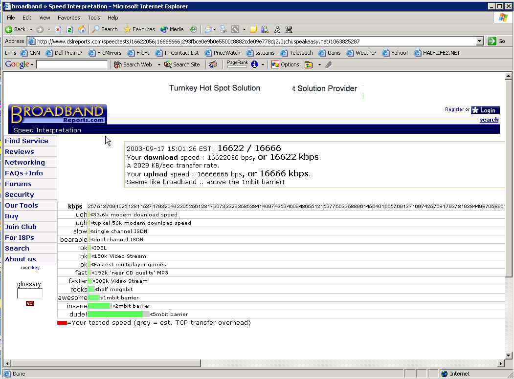 Miyagi Son Posted September 13, 2003 Share Posted September 13, 2003 bandwidthplace.net is VERY inaccurate. The Broadbandreports.com is one of the best out there.Try this url http://chi.speakeasy.net it is VERY accurate. The page is cached and it tells you not to reload the page to delete ur cookies if you are going to do it again. This is the best speed test you can find. Read the page before judging Link to comment Share on other sites More sharing options...