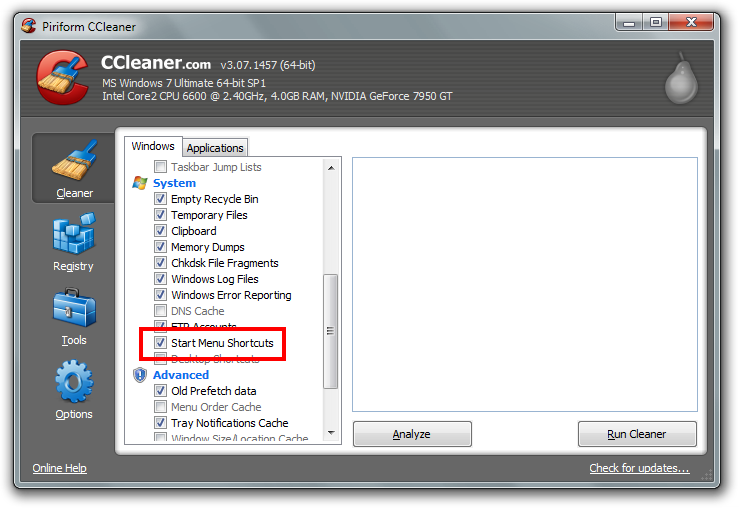 This is the option that was checked. All this is supposed to do is delete broken shortcuts in the Start Menu, nothing else. It's nothing to do with the registry cleaner, and the user is not at fault. Either CCleaner has a bug, or the shortcuts were corrupt somehow which caused them to be deleted.