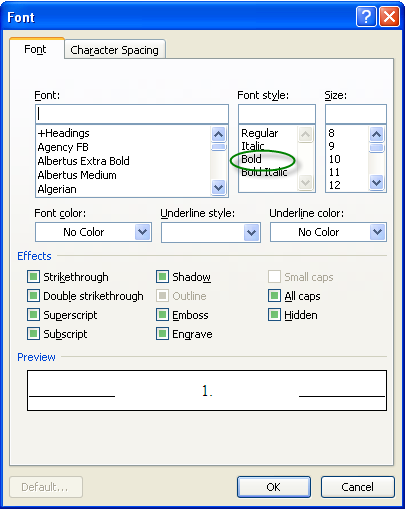 0 sc302 Veteran Posted July 10, 2011 Veteran Share Posted July 10, 2011 You will have to ctrl + b when you want to make those numbers bold. there is no way to do this as far as I know automatically....perhaps some sort of auto format but that would screw up everything you type after this document that had numbers in it. In other words, type type type ctrl+b number ctrl+b type type type type ctrl +b number ctrl+b type type type type. that isn't really an outline though, and outline is 1. blah blah blah blah <tab>A. blah blah blah 2. blah blah blah <tab>A. blah blah blah example of a typical outline, and what I was taught what an outline should look like way back when when we used typewriters to type: If you google "example outline document" you will find many examples similar to the one I show above. Link to comment Share on other sites More sharing options...