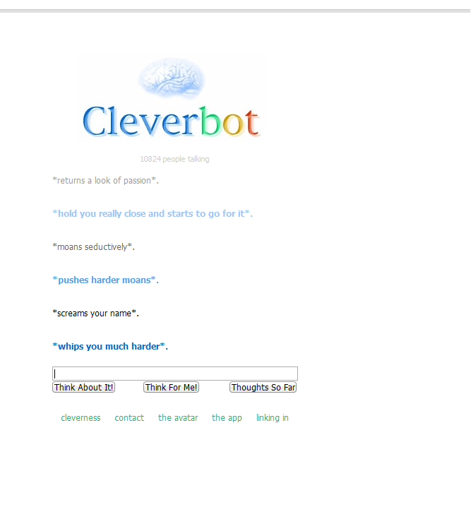 HawkMan Posted August 30, 2011 Share Posted August 30, 2011 User: Boring. Cleverbot: Teme. User: Huh? Cleverbot: Frog Blast The vent core. User: Are you insane? Cleverbot: I am not. User: You sound pretty insane. Cleverbot: Thanks(:. User: Are you sure you're not insane? Have you been tested? Cleverbot: Yes. I'm sure I'm not. Are you sure you're not? User: Yes. Cleverbot: I will try to speak clearer for you, then. User: Frog blast the vent core. Cleverbot: Are you drunk? User: Do you know what it means? Cleverbot: Perhaps not..? Explain? User: I was hoping you knew. Cleverbot: Raar. Link to comment Share on other sites More sharing options...
