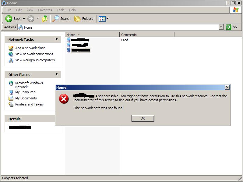 Ferret Posted September 24, 2003 Share Posted September 24, 2003 I got a problem with my network, My machine is the Win 2k3 machine, the other two in the house are WinXP - Problem starts that the two XP machines CAN access the Win2k3 machine, BUT my Win2k3 machine CANNOT access XP machines... I've just removed the names from the image, Thats the error I get when I try and access either XP machine ! Thanks, Ferret ! EDIT - It can't be Permission problems, when I had Win2000 and WinXP on this machine, it could access them other two XP machines ;) Link to comment Share on other sites More sharing options...