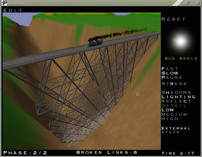 memNOC Posted September 26, 2003 Share Posted September 26, 2003 a "post your" thread in disguise :ninja: this one should be fun tho, so i hope its allowed.. if not, feel free to close/delete.. :D so, lets see your most astonishing/weird/simple/cheap/most proud of bridge construction made in the GREAT games by Chronic Logic.. the exact game doesnt matter, everyone is welcome to contribute.. Pontifex, Bridge Construction Set, Bridge IT, even Bridge Builder.. demos, full version, whatever.. if you havent played these sims yet, now is the chance to get addicted to bridge building.. and yea, i too thought it would be boring as hell when i first got into it, but here i am, 5 hours straight on it :woot: when posting, state the game, the time spent building the bridge and whatever you want to add.. (of course, dont forget the actual pic) anyways, here's one of mine im very proud of.. :whistle: its still not perfect, theres are a couple of beams that arent necessary, and some that need reinforcements.. thing is, its a VERY tight budget (110,000).. it actually looks easy enough, but you only get iron and steel beams, and 4 points to start from at the bottom of the canyon.. :o oh its BCS, and total construction time about 1-2 hrs.. sorry for bad quality, my comp sucks :( Link to comment Share on other sites More sharing options...