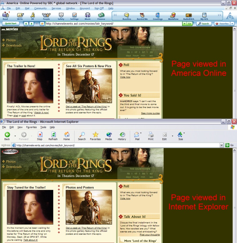 Hawkeye Posted September 29, 2003 Share Posted September 29, 2003 Anyway, back on topic. For those who have AOL, you can actually view the trailer now! Who says AOL members don't get perks? :p I have attached a screenshot (resized to a width of 800) comparing what you see in AOL with what you see in Internet Explorer for this URL: http://channelevents.aol.com/movies/lotr_keyword/ Look closely at the Arwen part of the graphic, and you'll see a difference. In the AOL version, you can click on a link to see the trailer. :D Link to comment Share on other sites More sharing options...