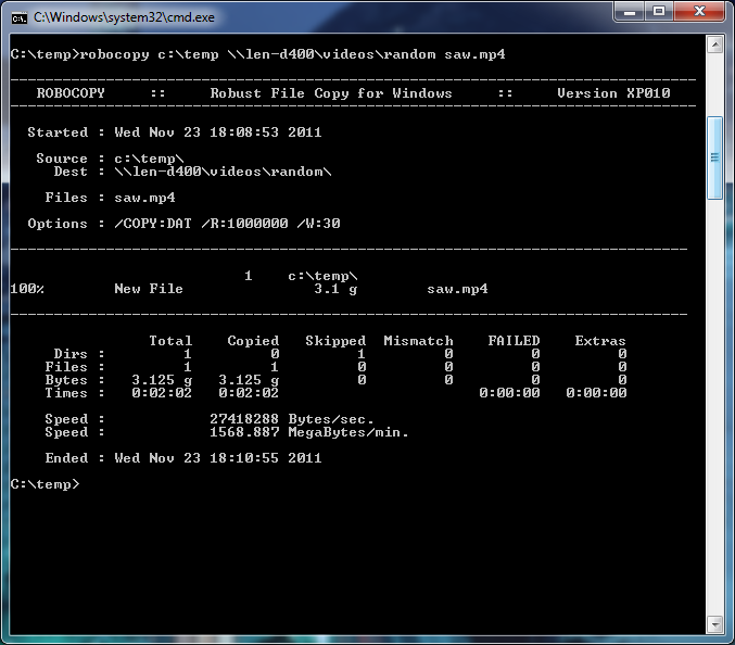 +BudMan MVC Posted November 23, 2011 MVC Share Posted November 23, 2011 do an actual Iperf test, I sure and the hell do not trust the speed that file copy dialog shows. As to network utilization -- very interesting, but its not showing 450 its showing 360 ;) Do a simple iperf, and or robocopy file copy -- where you will get an actual timestamp and bandwidth measurement. robocopy will take into account actually moving a file, so you could have bottleneck with disk, etc. iperf just check the wire or wireless. You can get iperf here http://sourceforge.n....0.zip/download Inside is actual exe, or you can use the java frontend if you want. Or grab netio here http://www.ars.de/ar....nsf/docs/netio Or robocopy is great test since its real world, moving a file! Link to comment Share on other sites More sharing options...