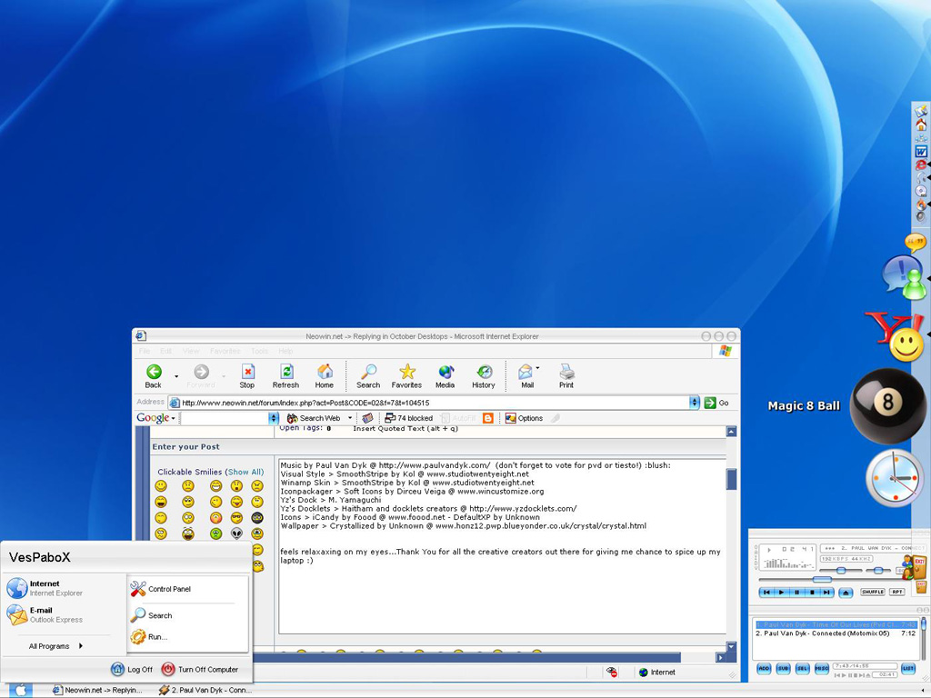 vespaman Posted September 30, 2003 Share Posted September 30, 2003 (edited) Music by Paul Van Dyk @ http://www.paulvandyk.com/ (don't forget to vote for pvd or tiesto!) :blush: Visual Style > SmoothStripe by Kol @ http://www.studiotwentyeight.net Winamp Skin > SmoothStripe by Kol @ http://www.studiotwentyeight.net Iconpackager > Soft Icons by Dirceu Veiga @ http://www.wincustomize.org Yz's Dock > M. Yamaguchi Yz's Docklets > Haitham and docklets creators @ http://www.yzdocklets.com/ Icons > iCandy by Foood @ http://www.foood.net - DefaultXP by Unknown Wallpaper > Crystallized by Unknown @ http://www.honz12.pwp.blueyonder.co.uk/cry...al/crystal.html *if my screenshot too big..i beg your pardon :( * feels relaxaxing on my eyes...Thank You for all the creative creators out there for giving me chance to spice up my laptop :) <<replaced with smaller attachment>> Edited September 30, 2003 by Dazzla Link to comment Share on other sites More sharing options...