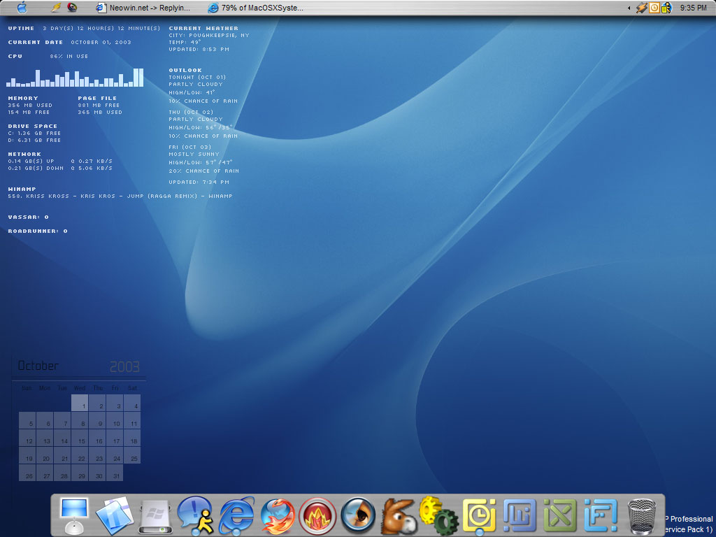Spykes424 Posted October 2, 2003 Share Posted October 2, 2003 *October Desktop*Theme: By Me (Unreleased). Wallpaper: By Me (Unreleased). Icons: iCandy Junior (With Some Custom And Converted By Me). Samurize: By Me (Current Weather, Hardrive Space, iPod Space, Free Memory, Date/Time). Rainlender: By Me (Calender To Match Samurize). Start Menu Mod: By Me (Opens Up iPod Contents In Windows Explorer). [Animated Picture - Image Size Reduced...] - PM Me For Anything Else...?:happy::> jeez everytime u tempt us with a better dp sum might have der patience runnin out if your ever gunna release, but so far its been sweet seeing the piece progress. still tweaking... not sure if i wanna go though all the hassle, when I mainly use it for just personal use, maybe ill work on some readme's this weekend? :shifty:: :happy:: WHOOHOO! :woot:: hey im not promising anything, but keep your eyes open... :shifty:: Link to comment Share on other sites More sharing options...