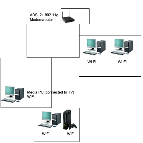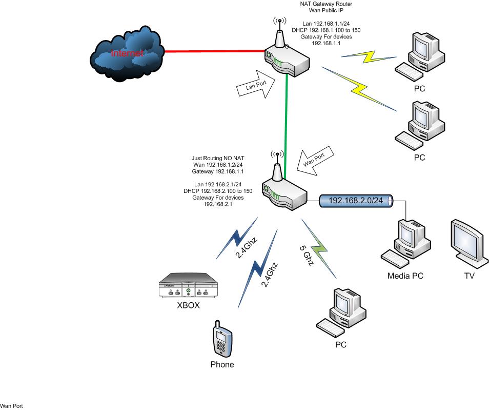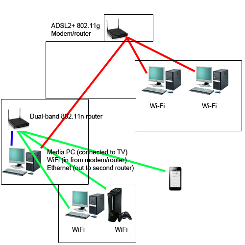 Scorpus Veteran Posted December 23, 2011 Veteran Share Posted December 23, 2011 Before I asked you guys about getting a dual-band router. Well now I have another interesting question. Here is my current network set-up: As you can see I have the router in a small room (previously a study) and everything in our house connects to it via WiFi I'm thinking of adding a second router in the following situation and I'm wondering if it's possible: Basically here, some clients closer to the modem/router connect to the original router, as well as the media PC. What I want then to add a second router that is directly connected to the media PC via Ethernet, which then connects to clients that are close to it in that end of the house such as my PC and Xbox 360. All clients will still need to be connected to the internet, and obviously the red-line (modem/router) clients are fine but I was wondering if in this set-up you could still deliver internet to the green-line clients. The dual-band router will not be connected to a modem (and so not directly to the internet) Essentially the dual-band router will share files from the media PC and the internet to the green-line clients; the red-line clients don't need the media PC to share files so that's fine. Is it possible? It could be a bit confusing For reference sake the router I'm thinking of adding to the media PC via ethernet is the Netgear WNDR3700 and some of the green-line clients would be connected via 5 GHz Link to comment Share on other sites More sharing options...
