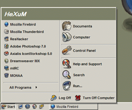 Dazzla Veteran Posted October 3, 2003 Veteran Share Posted October 3, 2003 You can change them within the shell32.dll. Use resource hacker or Microangelo Librarian. Wrong, they're in explorer.exe. Here's the bitmaps for the logoff and shutdown as well as the custom flag. They're numbered and easy enough to replace: Download If you're unfamiliar with replacing system files: http://www3.telus.net/_/replacer/ Replacer is your god. Result :) Link to comment Share on other sites More sharing options...