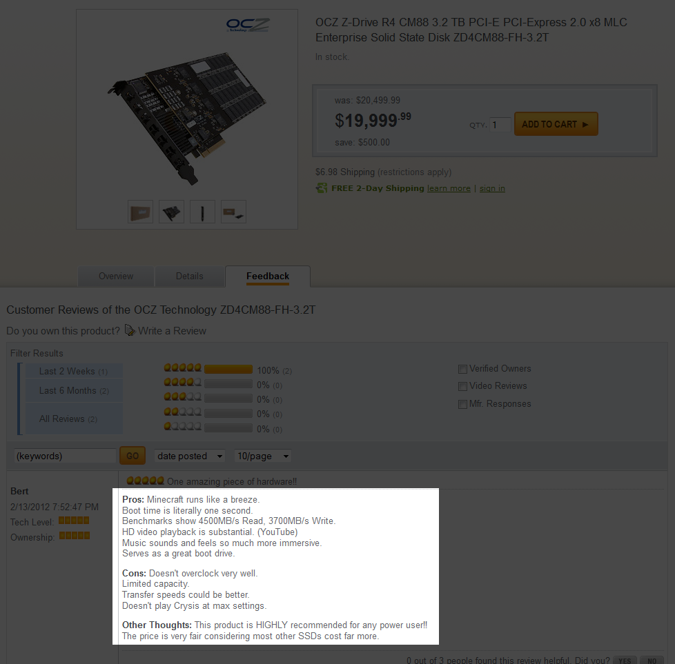 You're all morons who need to spend more time around real people and learn the art of sarcasm. Also, many of you only found one thing wrong with his post, per person. Clearly, Minecraft "running like a breeze" in a 3.2TB SSD review is for "lulz", in addition to "music sounding and feeling more immersive", AND let's not forget the Crysis comment you geniuses picked up on; lastly the final comment dealing with it being a better priced option than other SSDs, really? You people have to ask yourselves if this is somehow not 100% legit whether it be bot, joke, photoshop, whatever.