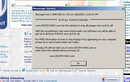 Dazzla Veteran Posted October 6, 2003 Veteran Share Posted October 6, 2003 Go to run and type services.msc, disable the messenger service. This has no effect on any messaging clients. Link to comment Share on other sites More sharing options...