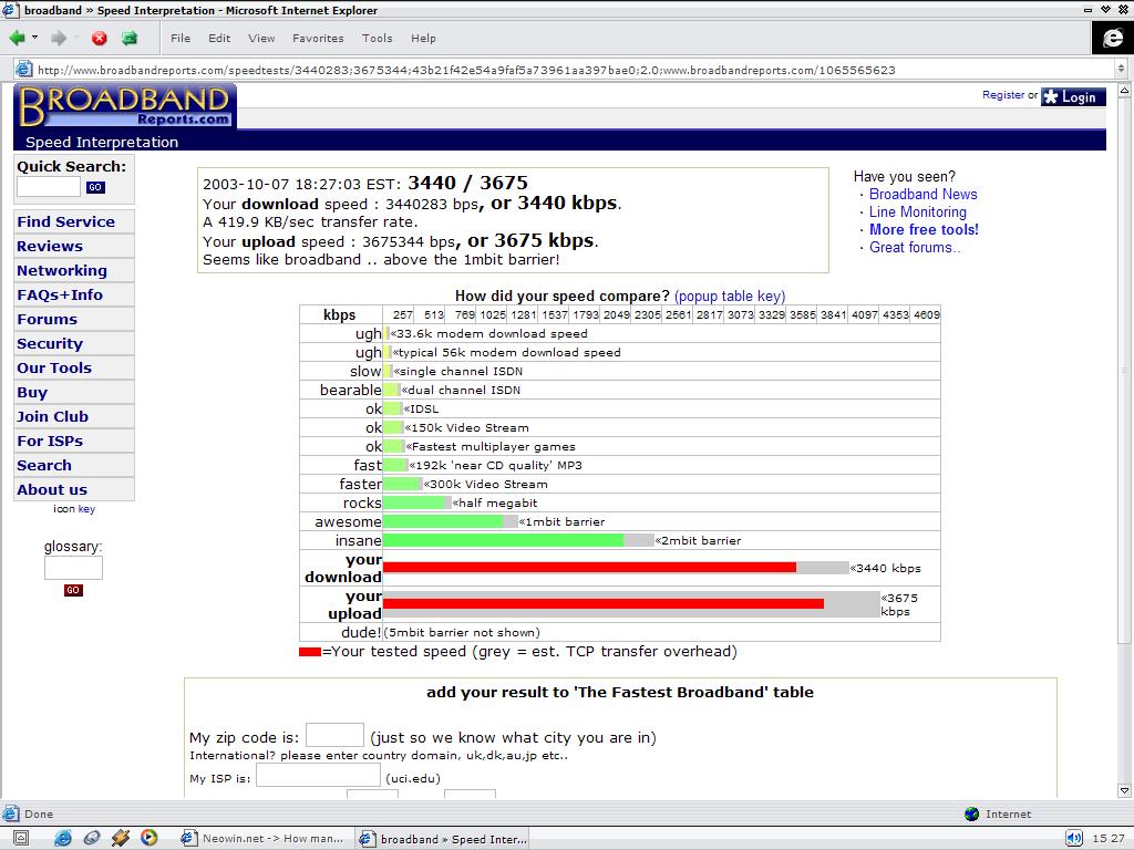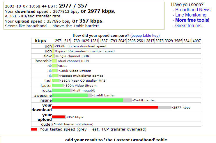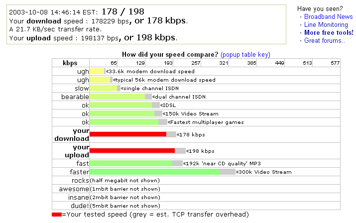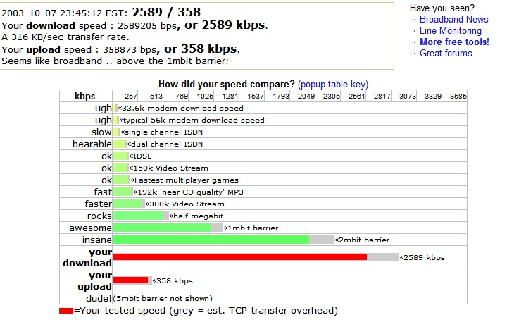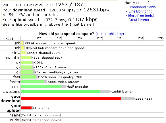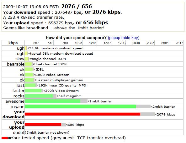 slayerx02 Posted October 8, 2003 Share Posted October 8, 2003 Download is a little above 1 Mbit and upload is crap but its only $39/month Link to comment Share on other sites More sharing options...