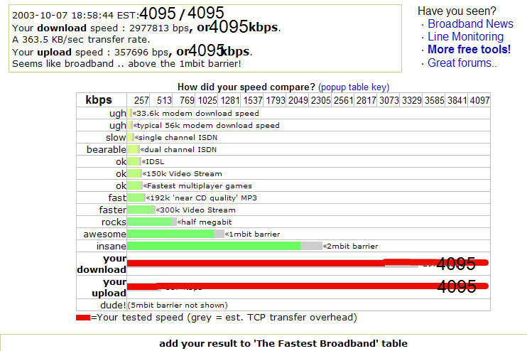 Dan.Varga Posted October 9, 2003 Share Posted October 9, 2003 just tested mine 2.3mbps down 256kbps up (damn caps) Link to comment Share on other sites More sharing options...