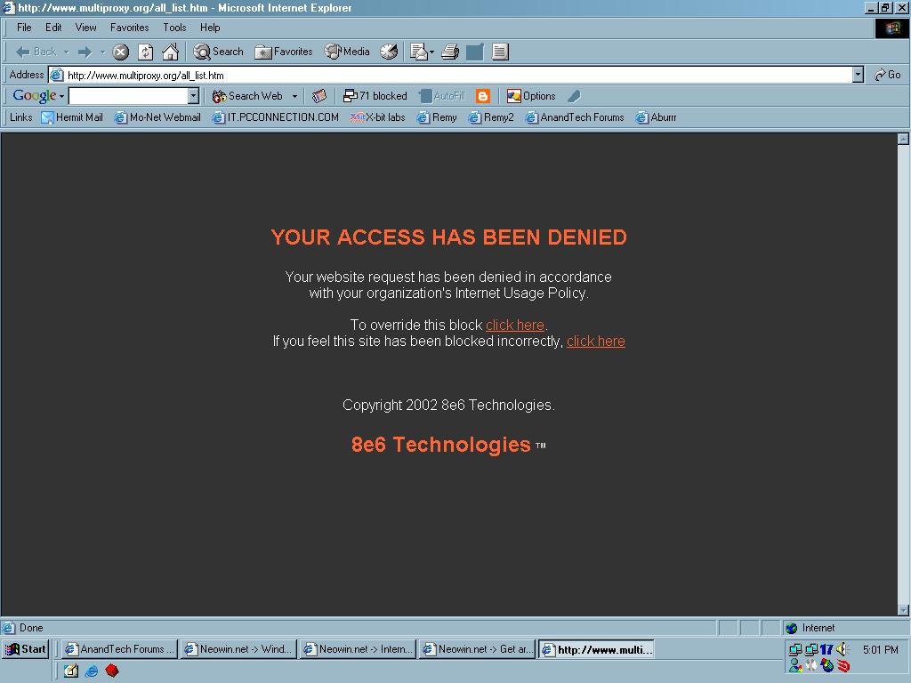 xxpor Posted October 10, 2003 Author Share Posted October 10, 2003 LOL: Access Denied The requested document, http://www.multiproxy.org/all_list.htm, will not be shown. Reason: Found in Denied List (Anonymous Proxies). Entry causing block is multiproxy.org. Link to comment Share on other sites More sharing options...