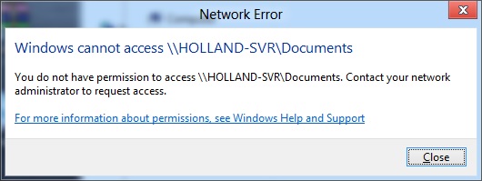 Axel Posted May 31, 2012 Share Posted May 31, 2012 Hi guys, I'm probably being an idiot but after installing win8 and mapping all my network drives and rebooting I'm now encountering this error. [Window Title] Network Error [Main Instruction] Windows cannot access \\HOLLAND-SVR\Documents [Content] You do not have permission to access \\HOLLAND-SVR\Documents. Contact your network administrator to request access. For more information about permissions, see Windows Help and Support [Close] My server is set up correctly and was working fine before. It would usually come up with a dialogue asking for username and password but NOTHING appears except this message. Many thanks.. Alex Link to comment Share on other sites More sharing options...