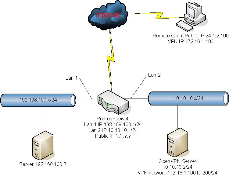 metro2012 Posted June 28, 2012 Author Share Posted June 28, 2012 Ok so you have 2 segments at work - that is nothing new. Normally they would be somewhat similar, ie 192.168.1.0/24, 192.168.2.0/24, 192.168.3.0/24 or 10.10.0.0/16, 10.11.0.0/16, etc. but sure you could have 1 segment on 192.168.1.0/24, another on 10.2.3.0/16 and say another on 172.16.1.0/23, etc. So a bit confused about lan1 and lan2 on your router. So what router is this? When you say external network on lan2 -- do you mean only this network as access to the internet? Do you have firewall rules between lan1 and lan2? So if I understand this right - you want to vpn in to a openvpn server on your 10.x network - and then access a server on your 192.168 network? This is not a problem - you just have to allow whatever rules you have on the router for traffic between lan1 and lan2 to allow for the IPs your going to hand out to your vpn clients. I have to assume that this openvpn server on your 10.x network already knows how to get to and can get to the server on 192.168 network? So I drew this up -- this is your setup right? So we can use this to discuss the problem. Lets correct this drawing so we have something to work with when discussing the setup. So I am guessing that is your network your talking about. And that your client is coming from the public internet and wants access to your server. Is that correct? And your router/firewall is your gateway for both your 192 and 10 networks? Does not matter if the ip ranges are exact, only that they are close so we know what we are talking about, etc. yup. unless ive missed sumthing (i hope not) that is exactly the setup :) The VPN network should be from 10.10.10.3 to 10.10.10.100 (for example). i comment because of the 172.x.x.x range u suddenly put there. not to further manipulate the configuration on the real devices, is your opinion that i should emulate this in a vm enviroment??? thank u budman. Link to comment Share on other sites More sharing options...