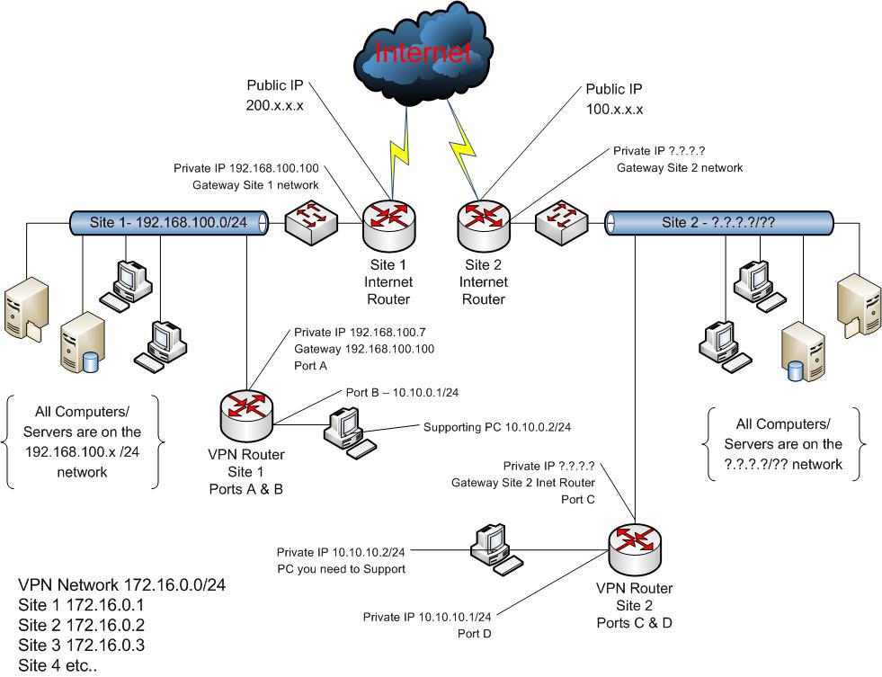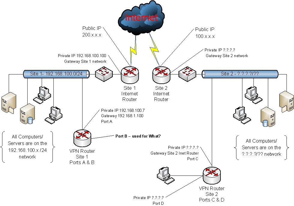 +BudMan MVC Posted June 29, 2012 MVC Share Posted June 29, 2012 Ok here is how I understand your network -- have not put in any vpn details. But this is your 2 sites, with the 2 routers your wanting to use for your VPN to connect the 2 sites together and how they are attached to the current networks. How I am understanding it so far. What I don't understand is why the 2 vpn routers in the first place? What are the model numbers of the internet routers at these 2 locations. The same devices that you PM'd me? And I can understand at site 2 hanging something off of port D that you want to access from site 1. But I am confused on what you think port b on vpn router in site 1 is needed for? Where do you want to access this PC connected to port D from in Site 1? "Router 1's port B will be used for servicing the device (another network different)" What is the network ?.?.?.?/?? Is this another PC, why can you not just access the device on site 2 vpn router port D from some device on your 192.168.100.x/24 network. So you don't want any other devices on Site 1 to be able to Talk to any other devices on Site 2? if the internet routers at the sites are the same model as you sent in PM, why can you not just create a site-to-site vpn using those routers and let all devices from Site 1 talk to devices on Site 2. Really need to understand what network is over at Site 2 to tell you how to get this to work. Or run into the possibility of stepping on the network they are using. For all I know they are also using 192.168.100.0/24 ??? If you want devices from site 1 to talk to devices in site 2 I would just setup a site-to-site vpn something like this. then all your devices could talk to each other - like they were the same site really, just a bit slower depending on your internet speeds. Link to comment Share on other sites More sharing options...