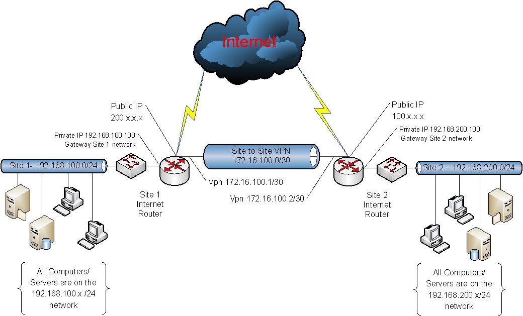 +BudMan MVC Posted June 29, 2012 MVC Share Posted June 29, 2012 "shouldnt matter what site 2/3/4/5/etc has. this is what was told by us; doesnt matter what they other network has." Who told you that? You can not have a vpn with with the same network on both sides! Yes in general if your running an ODD ball network on your side, its unlikely that you will run into a problem. But sorry you can not vpn network 192.168.100.0/24 at site A if site B is using the same address space, ie 192.168.100.0/24 Now you could NAT in the case of same network on the other side, etc. So you can work around it - but understanding the address space on both network is kind of requirement! "the reason for the 2 vpn routers is because one (site a) will act as a server and the other (site b) will act as a client." But you already have 2 router that can do VPN, your internet routers! Why do you think you need more? Just create the vpn between your 2 internet routers. And yes you can repeat for sites 3, 4 and 5, etc.. Your making it way more complicated trying to put the vpn endpoint on the inside of the networks vs at the gateway. So section 4.6 on the manual for the routers goes over VPN. You can do this on your internet routers, you don't need routers inside your network to act as the vpn serves. And you could ipsec vpn as well, section 4.6.2 to your other sites. And yes if done on the internet router with openvpn one would be the server and the other end would be considered the client. BTW I use visio for my drawings. Link to comment Share on other sites More sharing options...
