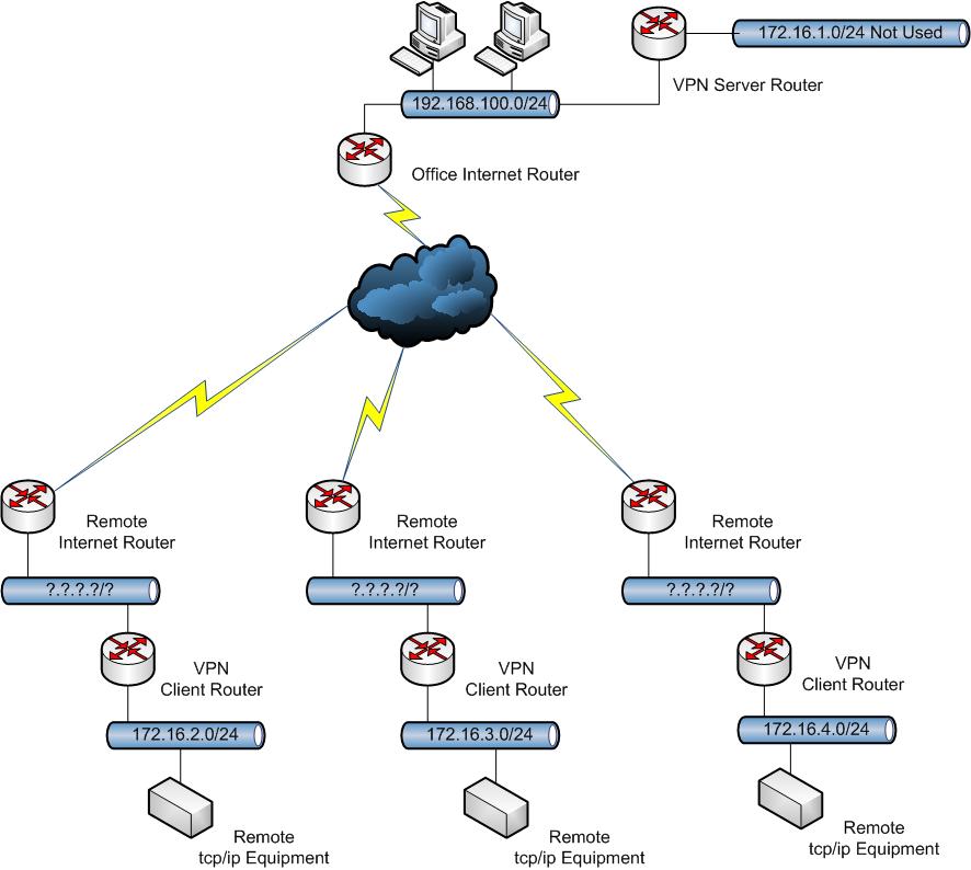 +BudMan MVC Posted July 15, 2012 MVC Share Posted July 15, 2012 "if i connect to the openvpn server at my office, that makes me a client right?" If use a VPN client to connect to it then yeah -- Why and the F would you do that??? Your on the same freaking lan! If you don't use the openvpn client, or on the client network that the remote vpn routers then NO your not a client. BTW, that drawing is the best you have put up so far -- other than leaving out all the NAT routers that are in front of all the vpn clients and the vpn server. edit: Ok this is a better drawing of what your doing - is it not? You have no idea what the remote private networks are. And your remote devices are on some 172.16.x vpn networks. But your trying to admin/support them from boxes on the 192.168.100.0/24 network at your office. And your using 10.10.x addresses as your vpn tunnel endpoints. And you have route in your internet router to point to the vpn router for the different remote 172.16.x.x/24 networks I add this detail because its IMPORTANT to understand this - or your drawing just looks like a simple site to site vpn setup. Nor are these 192.168.100 boxes "clients" of the vpn server router. They are not running openvpn client software? Are they? Link to comment Share on other sites More sharing options...