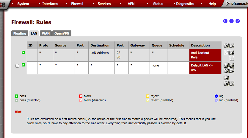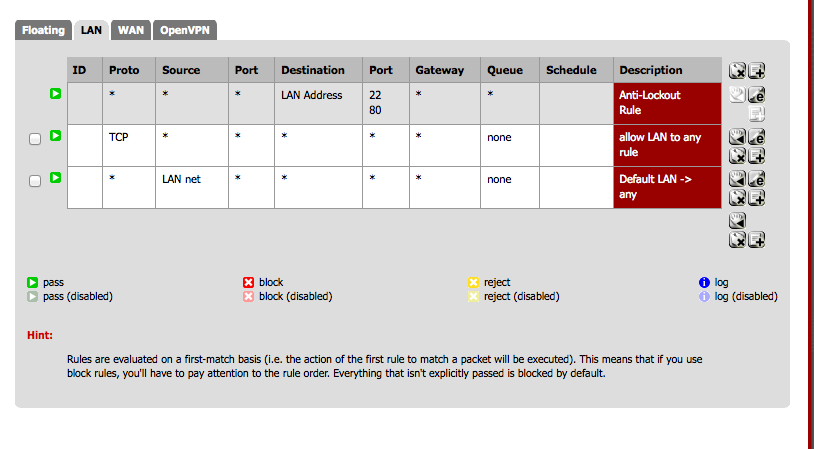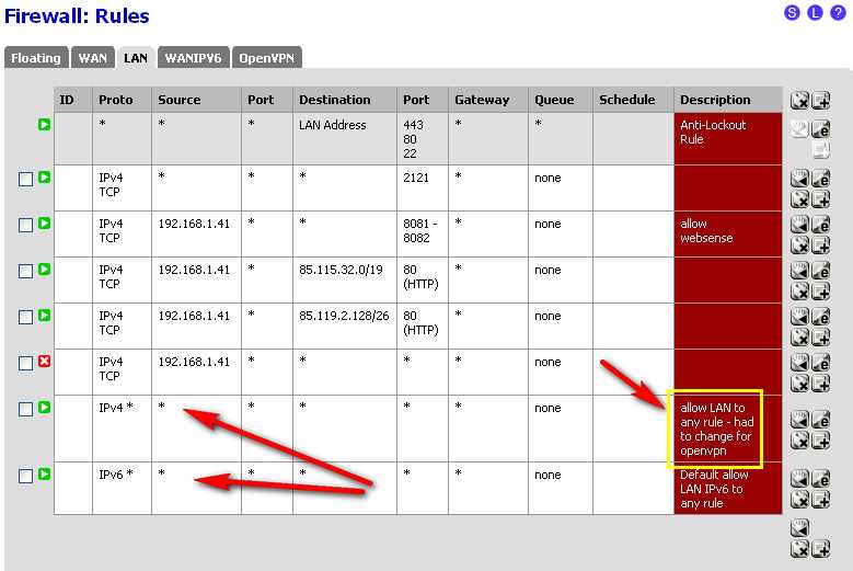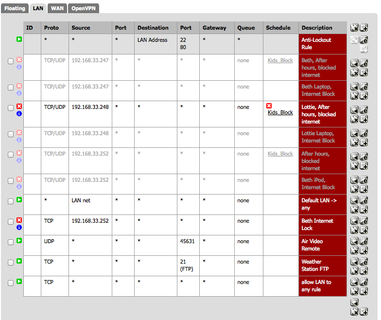 Rules go down in order from top, first rule that hits is one that is applied - be it allowed or blocked. Notice in my lan rules the ones for .41 address - I allow it access only to the websense stuff, then I block its access for anything else! So if say .23 comes it, he goes past all those rules until he hits my allow rule.