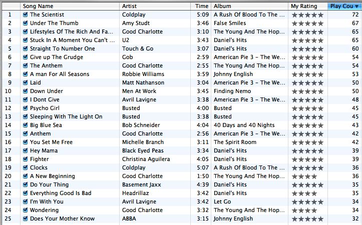 cerbero Posted October 23, 2003 Share Posted October 23, 2003 thats what i do too too. i dont have just random songs on my computer, its all full albums. but i will try and see what kinda list i can come up with later. :) I have a smart playlist called "Singles", which are all the songs I have that are not part of an album. Right now it contains 32 songs :) The other 2230 songs are all albums. Right now though, White Rabbit by Jefferson Airplane is getting a lot of playtime. Link to comment Share on other sites More sharing options...
