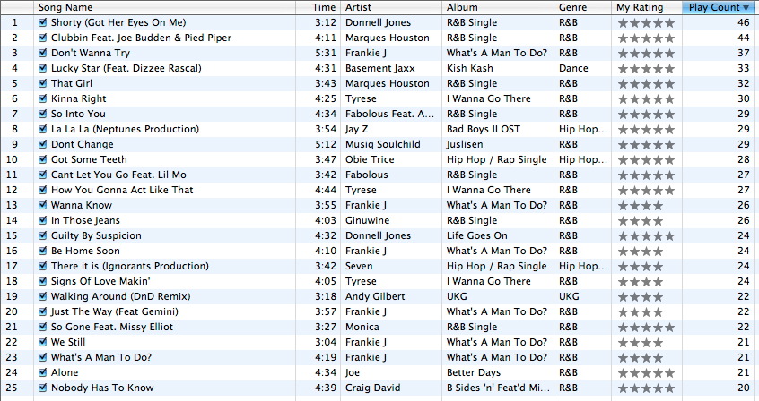 Steve Posted October 23, 2003 Share Posted October 23, 2003 LOL Dan, Didn't we talk about this the other day?! :p My top 25 is pretty much all R'n'B with a little hip hop, unfortunately,i don't seem to rack on plays on all my UK Garage, despite me havig so much! - ah well, no reppin' UK music, i guess ... actually, got a few UK artists! :) Craig David Dizzee Rascal Basement Jaxx Andy Gilbert ...***t, thats pretty poor :( Link to comment Share on other sites More sharing options...
