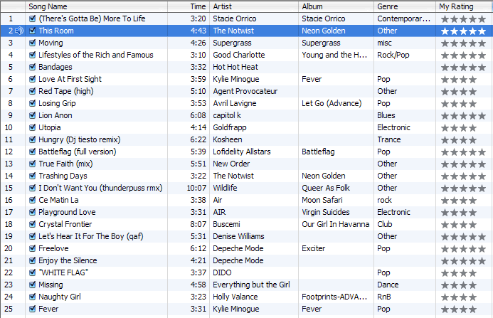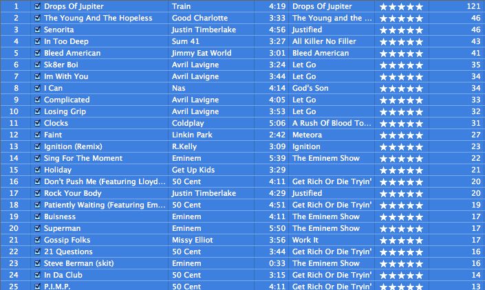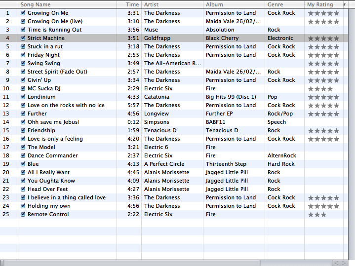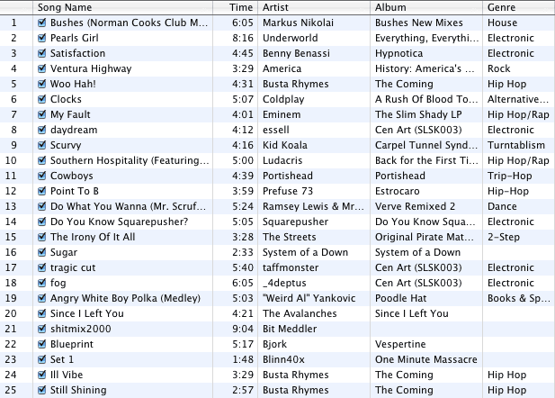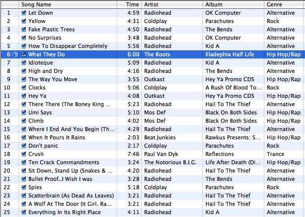 michael.b Posted October 23, 2003 Share Posted October 23, 2003 I have a smart playlist called "Singles", which are all the songs I have that are not part of an album. Right now it contains 32 songs :) The other 2230 songs are all albums.Right now though, White Rabbit by Jefferson Airplane is getting a lot of playtime. I will post mine shortly... But in response: Remember what the doormouse said... China Cat sings a great White Rabbit cover... and Blue Man Group provides an interesting twist on the sound of the song. Link to comment Share on other sites More sharing options...