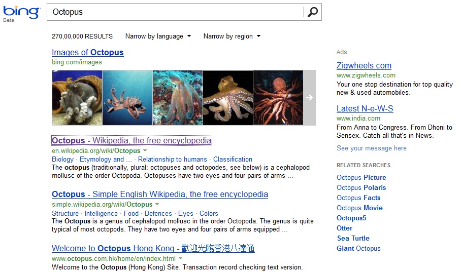 starbearer Posted September 22, 2012 Author Share Posted September 22, 2012 Octopus Wikipedia page is first result for me. (Also who the hell doesn't know what a octopus is?) Just wanted to look up something about them. But on Google India, there's no mention of what an Octopus is, anywhere in the search results. They all go on about Octopus cards and moves etc. Also, last week, I had seen that "Bing it on", and Google won all rounds but 1. I just found this result strange. Link to comment Share on other sites More sharing options...