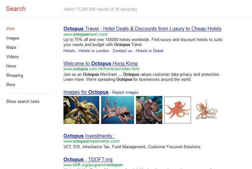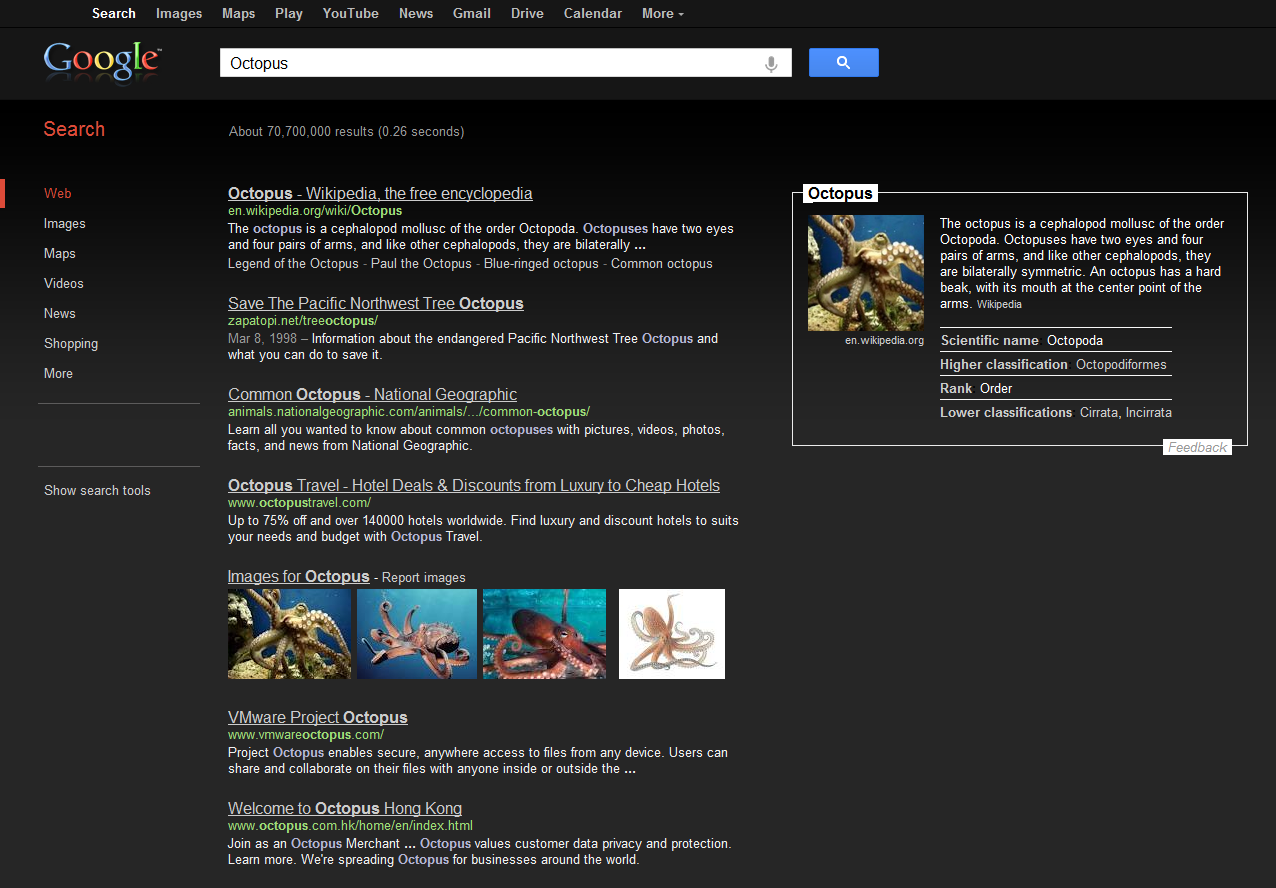 starbearer Posted September 22, 2012 Share Posted September 22, 2012 This was a regular search for a regular (i.e. not uncommon or ambiguous) search item, an Octopus While I'd normally expect search engines to throw up links which explain what an Octopus is, as that would be the more common ( and sane) answer, the results I saw with Google were a bit baffling. While Bing gave an expected search result, with a wiki link to an Octopus and definitions of an Octopus etc.,there was no such link to an Octopus anywhere on Google. Isn't this a bit weird? Link to comment Share on other sites More sharing options...
