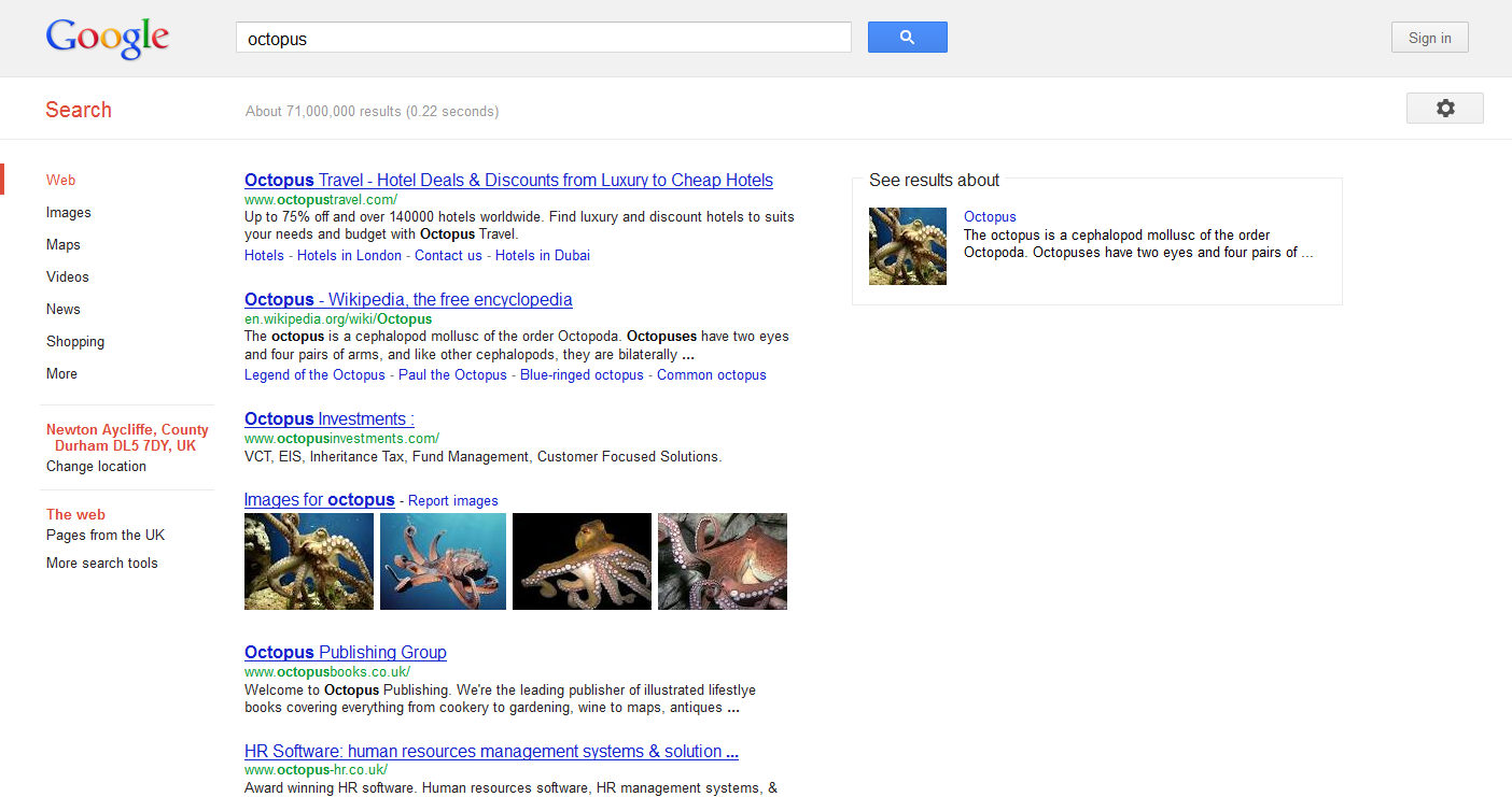 leesmithg Posted September 22, 2012 Share Posted September 22, 2012 Octopus Wikipedia page is first result for me. (Also who the hell doesn't know what a octopus is?) It is, 'an' Octopus b.t.w. Google make money throught their search engine. So if someone has a Cat and call it tiddles and people search for the 'a+cat+named+tiddles' and the owner of that cat has paid for that search to be numero uno, then google will make sure it's #1. Link to comment Share on other sites More sharing options...