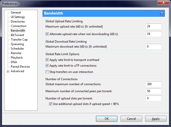 +BudMan MVC Posted September 25, 2012 MVC Share Posted September 25, 2012 And let us see that graph - you didn't post any graph that I see. And you also have it set to use more upload slots if your speed is not at least 90%, I would uncheck that if your worried about uploading. edit: One thing the graph will show us for sure is what utorrent has the limit set too, and what your sending. I find it hard to believe that if actually set for a limit of 24, that it would be sending 350.. Makes NO sense at all. Please post a graph showing this so we can all be sure we are looking at the same thing. And that in fact utorrent is taking your setting, maybe there is something in advanced or something that has been tweaked? Or something is just corrupted and utorrent is not seeing your setting of 24? I want to make sure there is no confusion between KBytes and Kbits -- also I don't believe that global limit takes into account local peers? Link to comment Share on other sites More sharing options...