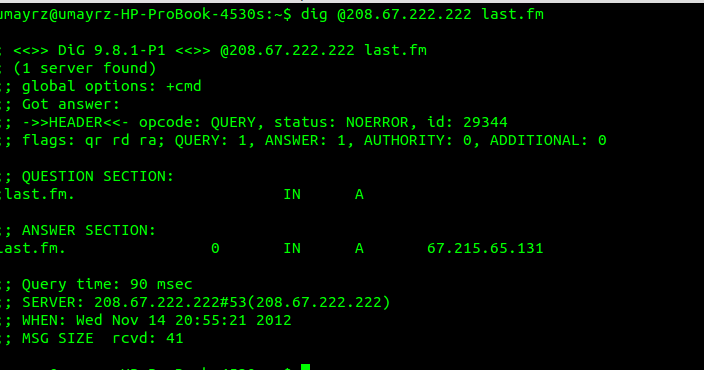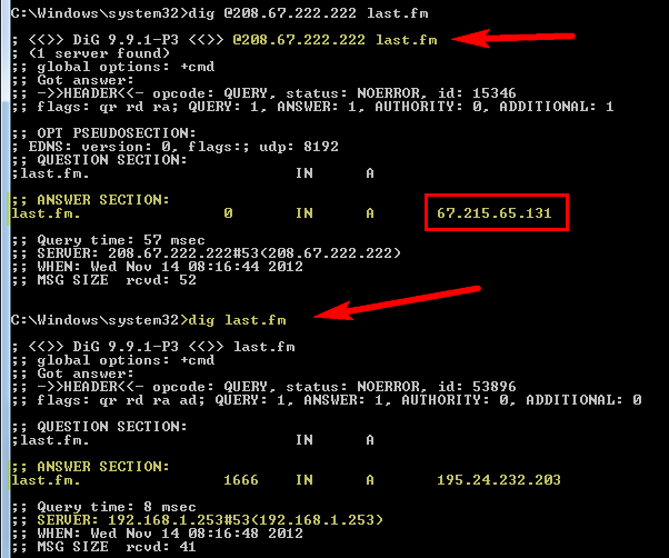 Koshur Posted November 14, 2012 Author Share Posted November 14, 2012 (edited) Here is the output for dig last.fm umayrz@umayrz-HP-ProBook-4530s:~$ dig last.fm; <<>> DiG 9.8.1-P1 <<>> last.fm;; global options: +cmd;; Got answer:;; ->>HEADER<<- opcode: QUERY, status: NOERROR, id: 47297;; flags: qr rd ra; QUERY: 1, ANSWER: 1, AUTHORITY: 0, ADDITIONAL: 0;; QUESTION SECTION:;last.fm. IN A;; ANSWER SECTION:last.fm. 15 IN A 195.24.232.203;; Query time: 14 msec;; SERVER: 59.179.243.70#53(59.179.243.70);; WHEN: Wed Nov 14 23:04:01 2012;; MSG SIZE rcvd: 41umayrz@umayrz-HP-ProBook-4530s:~$[/CODE] SInce dnsomatic still shows" waiting for first update" I am also looking at this article(http://www.opendns.c...port/article/92), Tried updating through a URL "[color=#2C3034][font=Arial, Helvetica, sans-serif]Note: The URL to use to send an IP address update to OpenDNS is:[/font][/color] [color=#2C3034][font=Arial, Helvetica, sans-serif]https://updates.opendns.com/nic/update?hostname="[/font][/color] It returned as - [color=#000000]good 59.177.xxx.xx[/color] Edited November 14, 2012 by Koshur Link to comment Share on other sites More sharing options...