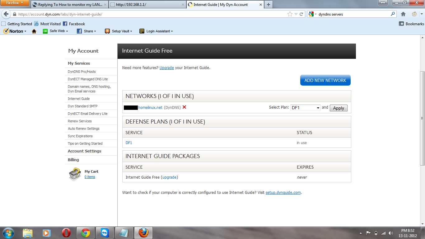 Koshur Posted November 13, 2012 Author Share Posted November 13, 2012 As far as i can tell, my ip changes at least twice in 24 hours! (or is there is a standard method to check this), and also when i drain and reboot my router (plug out the ADSL) i get a new IP everytime. daemon=300 - did not change this value for ip renewal, just copied it for testing. You can have any client on your network keep your dynamic IP updated with opendns using their client software if your router does not support it. Thats right, and they suggest using ddclient for linux platforms. Do you not have Any windows clients or mac clients somewhere on your network?? Yes i have two machine running windows, but i want to monitor a linux based machine that my brother uses. Once i test it on my linux machine, i'll configure his too to use ddclient (i have a dual boot), which is y m stuck with ddclient. Senario 2- when i use a premium service from Dyndns. (my router CAN forward to DYNDNS.COM) >i add my network there. >apply content filtering (a defense plan - DF1) >and add my credientials (hostname, username, email and pswd) on router page. > Replace my current DNS resolvers with the following on the router : 216.146.35.35 216.146.36.36 Now when i do all this, the filtering and rules apply instantaneoulsly to all Windows machines(for both opendns and dyndns). But not on linux clients. Tried blocking last.fm and it worked on win clients!! Link to comment Share on other sites More sharing options...