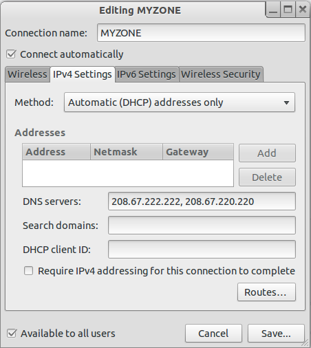Koshur Posted November 13, 2012 Author Share Posted November 13, 2012 Hi Budman Use discovered only sounds like it will be using your ISP dns? Does it hand that out to your dhcp clients, or hand out the 2 you have listed there - opendns? -- All my clients get the dns servers that i list here. i.e OpenDNS and not my ISP DNS. Here is the other option that says Auto discovery of DNS I have a dynamic IP, whihc is why i added the my network in opendns dashboard. Here is what i followed for ddclient config settings /etc/ddclient.conf:daemon=300syslog=yesmail=rootmail-failure=rootpid=/var/run/ddclient.pidssl=yesuse=web, web=myip.dnsomatic.comprotocol=dyndns2server=updates.opendns.comlogin=your_email_address_registered_with_OpenDNSpassword=your_OpenDNS_passwordYour_OpenDNS_network_label/etc/default/ddclient:run_ipup="false"run_daemon="true"daemon_interval="300"[/CODE] Just to rewind.. All filtering and policies work flawless on win 7 (purchased dyndns pro account - my router offer support for that). All win machine on network are now filtered. but as soon as i boot to ubuntu and try to debug by ddclient it throws error. Here is the error i get on debug - http://www.linuxques...problem-532194/ Unfortunately using -force option didnt help. Also i followed this(https://help.ubuntu....nity/DynamicDNS) to cross check my settings for ddclient. One more thing, i tried dnsomatic instead of opendns to update my IP but no luck there, i cant get my IP updated so that it sync's to the filtering policies. Link to comment Share on other sites More sharing options...