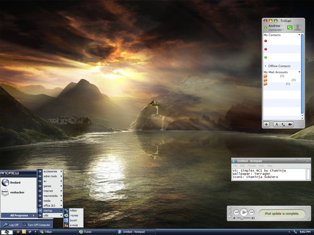Dustin B. Posted November 16, 2003 Share Posted November 16, 2003 VS: Astronomy, (Unreleased Slate Scheme)Wall: something from Longhorn (I think) Programs: DesktopX, WindowFX Icons: PixOS http://www.dumbassjones.com/novemberdeskto...162003thumb.gif Click if you wanna see more :p How did you change the icon used to display the scanner? I have tried with TuneUp Utilities 2003 - Icon Engineer, but I can't change that one icon... I changed the scanner icon by reshacking the wiadefui.dll file in the system32 folder ;) And as for the Slate scheme to Astronomy, it will be in the next update :p Link to comment Share on other sites More sharing options...