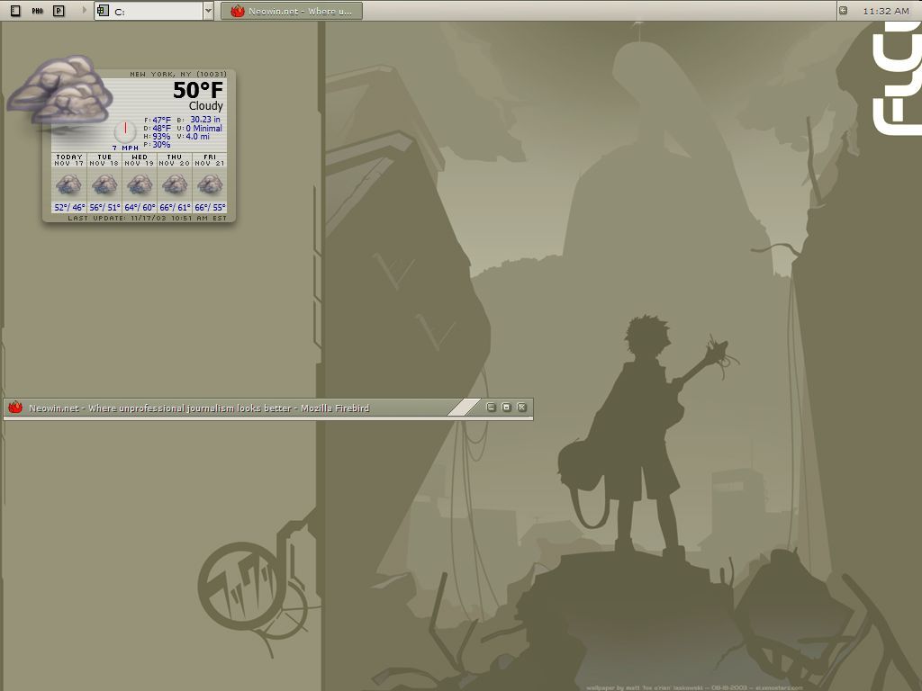 vip Posted November 17, 2003 Share Posted November 17, 2003 I love mine. (Most wont.)My Screenshot. nice wallpaper :) too many icons for my liking though :p Link to comment Share on other sites More sharing options...