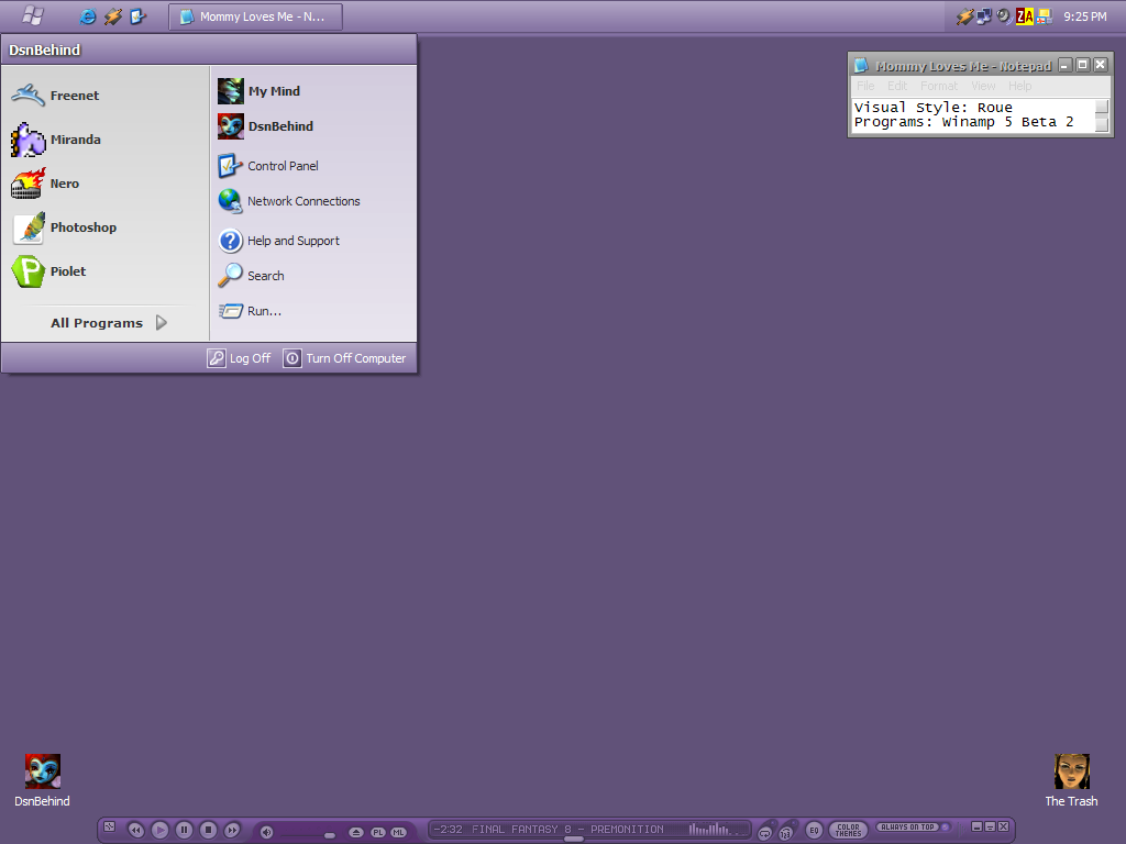 Beginning Posted November 18, 2003 Share Posted November 18, 2003 Very fine stuff, Very fine... :) Here's my second desktop post this month: VS = Simplex RC1 by ChaNinja Wall = Azure Winter Bliss Mod by me..... Icons - You know what they are... YsDock - Discontinued... " D**n " Apps = Mozilla Firebird 0.7 , Winamp5 Beta 2 Click Image To Explode.... :) Link to comment Share on other sites More sharing options...