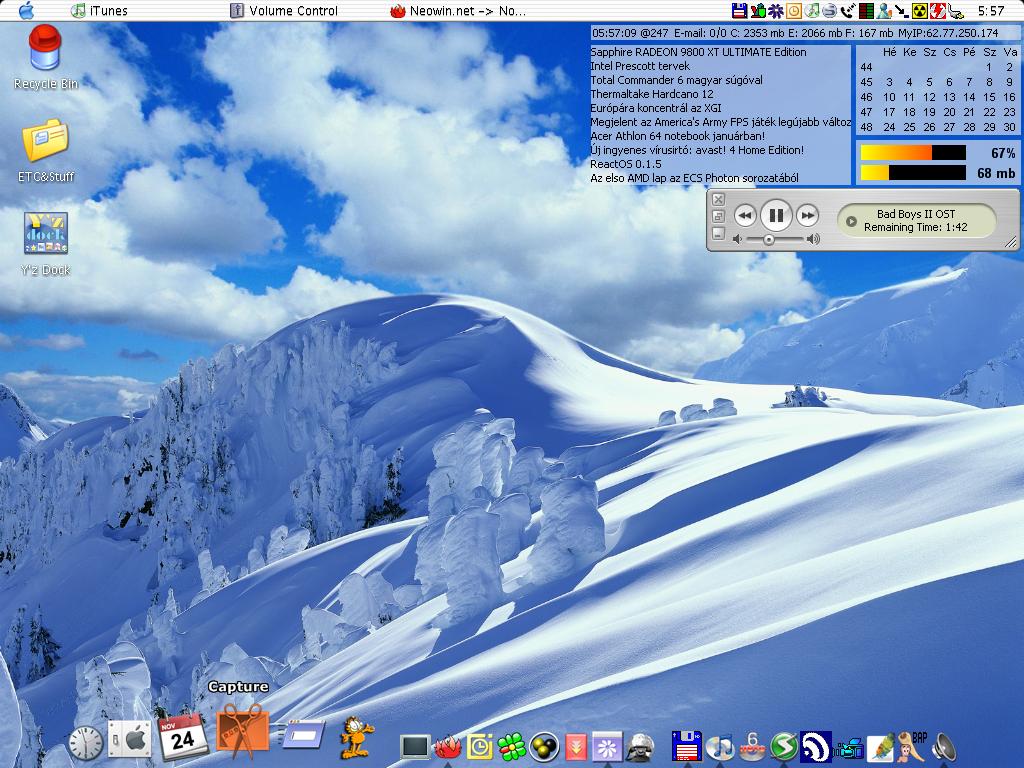 RadishTM Veteran Posted November 24, 2003 Veteran Share Posted November 24, 2003 Visual Style - 'Aluminum Alloy' port by KoL Wallpaper - 'Dark Toxic WinFlag' Wallpaper by KoL Y'z Dock - No shadow 'Aluminum Alloy' Skin Radish? Link to comment Share on other sites More sharing options...
