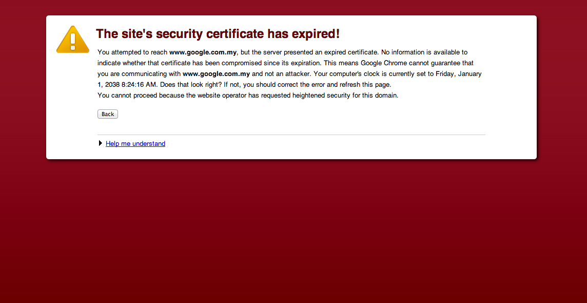 NeoWind Posted December 15, 2012 Author Share Posted December 15, 2012 I'm more intrigued about why you would be setting your PC's clock to the year 2038. The reasons for why a certificate would be "expired" by that point are fairly obvious. just to check it out. :shifty: why can't set the date 2039 ? Link to comment Share on other sites More sharing options...