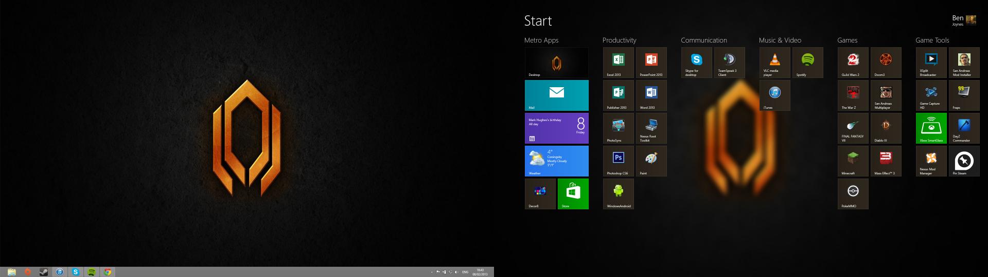 McKay Posted February 8, 2013 Share Posted February 8, 2013 SK[' timestamp=1360342545' post='595510144]I like the blured background on the Start screen McKay. I bet it looks good transitioning from Desktop to the Start screen. Thanks, used Decor8, I really like it. I wish Microsoft had given us the option of our own backgrounds in the first place, this one is good because it'll colour the tiles to match your wallpaper too. Link to comment Share on other sites More sharing options...