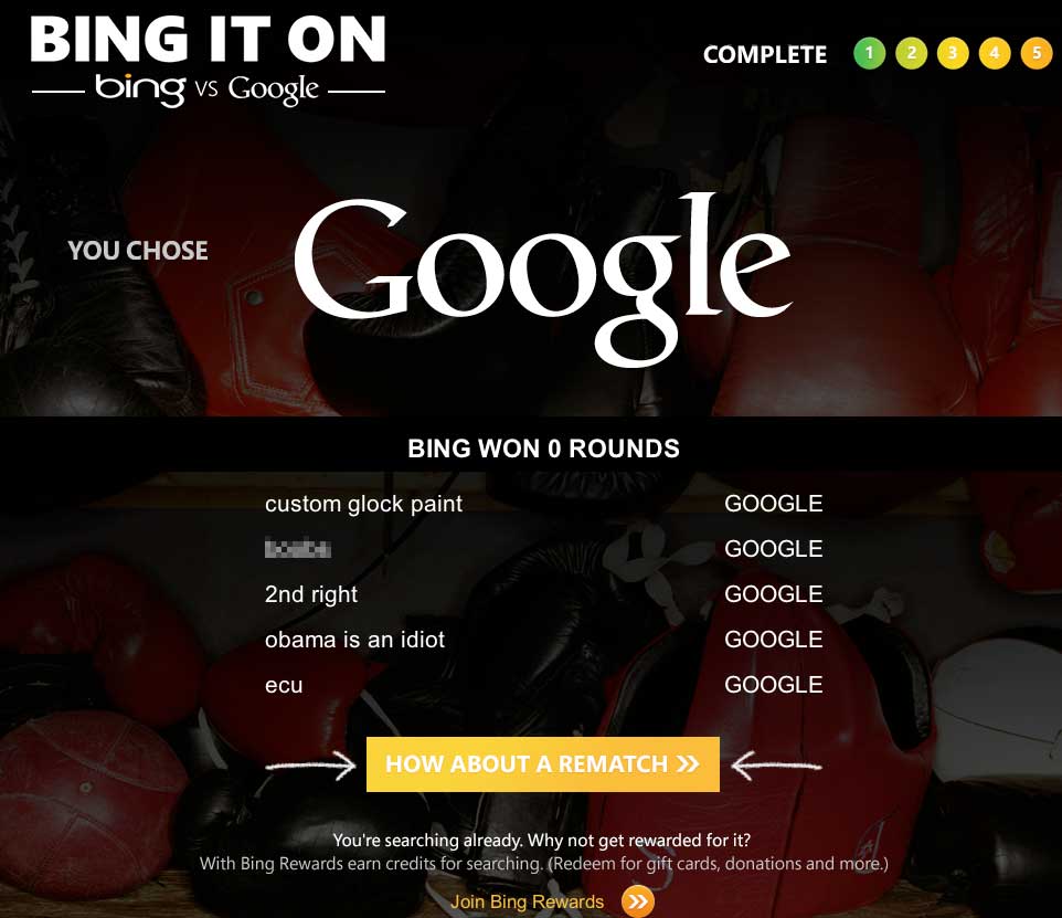 +Gary7 Subscriber² Posted February 18, 2013 Subscriber² Share Posted February 18, 2013 Bing won 4 out of 5 rounds for me. Link to comment Share on other sites More sharing options...