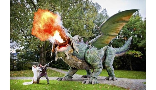 Hum Posted September 14, 2013 Share Posted September 14, 2013 Broadsword? Check. Shield? Check. Liquid courage? Gulp! OK, you're ready to take on the dragon.At nearly 30 feet high, this fire-breathing monster looks unreal enough, but it's very real indeed. It's also the world's largest walking robot, according to the new "Guinness World Records 2014" book, released Thursday.Built by Germany's Zollner Elektronik AG, an electronics maker, Tradinno the dragon is 51 feet long and has a wingspan of 40 feet.Tradinno, a play on "tradition" and "innovation," can walk around, flap its leathery wings, and breathe fire from its mouth and nostrils. The 11-ton mechatronic beast may not be able to fly, but it sure can make an impression.The dragon is a complex radio-controlled quadruped running on a 2.0-liter turbo diesel engine with two hydraulic circuits, 272 hydraulic valves, 65 animated axles, and 238 sensors, according to Zollner. It has 984 feet of hydraulic lines, more than 4,200 feet of electric cables, and 360 feet of pneumatic lines.Add to that nine modular control units, each with Texas Instruments digital signal processors and Fujitsu communication microcontrollers.Getting the dragon to walk properly was no mean feat. Each leg has seven mobile degrees of freedom, allowing it to walk around corners and even move laterally. The company says it took out a patent on the control concept in combination with the walking algorithm.Tradinno's wings are sheathed in polyurethane and reinforced plastic. Its main function is to act in a play, so veins are filled with 21 gallons of stage blood, while 24 pounds of liquid gas allow it to spit fire.When the monster isn't strutting its stuff, it gets from place to place on an all-wheel drive 2.0-liter turbo diesel transport vehicle. Not as cool as flying but still pretty boss."Realizing a radio remote-controlled, outdoor-capable four-legged robot walking robot in unheard-of dimensions, was what really motivated the developers and designers at Zollner Elektronik AG," the company writes."The other fascinating aspect for the team was the fact that the mechatronic system was to star in the oldest German folk play."That piece of theater would be the Bavarian town of Furth im Wald's play "Drachenstich." I've never heard of it either, but now I definitely want tickets.source & video Link to comment Share on other sites More sharing options...