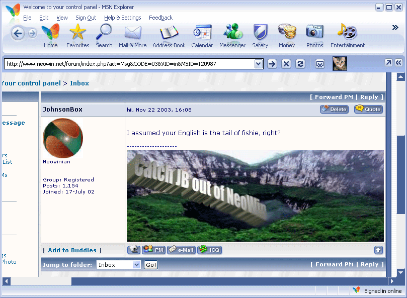 JohnsonBox Posted November 22, 2003 Author Share Posted November 22, 2003 why don't you ever post anything we can read? What is your first language and where are you from? :) Who is "we"? :rolleyes: Link to comment Share on other sites More sharing options...