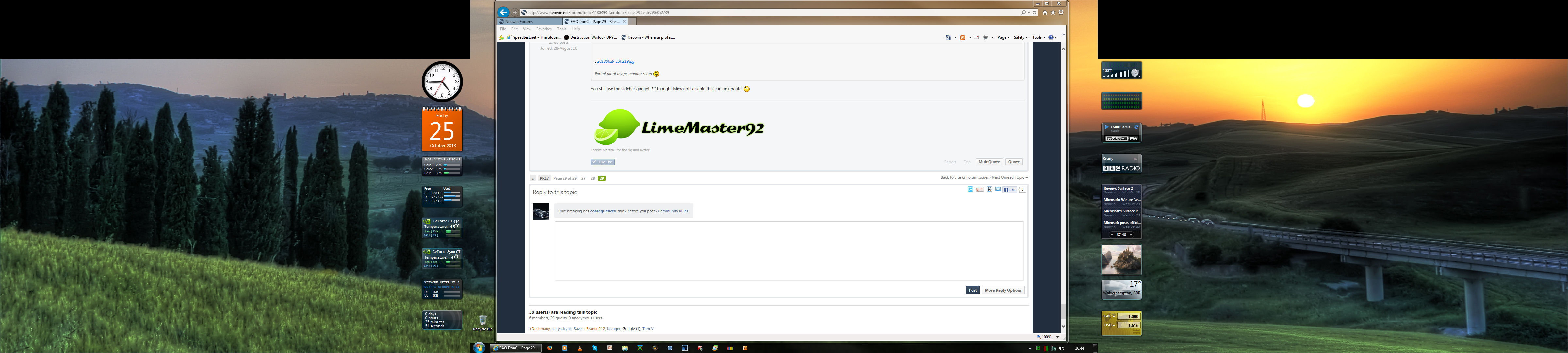The Evil Overlord Posted October 25, 2013 Share Posted October 25, 2013 For some reason I thought Microsoft disabled them, but I suppose its good that they didn't as people still seem to use them. :) I'd be ###### if they disabled em, but I have a couple of fall back sidebars too if needed I like it, specially when I'm bored and can listen to the radio via them, weather gadget's pretty accurate newsfeed is set to neowin (and only neowin since I had thoosje's sidebar back in 2003 I think. it's how I learned about the site) hard drive gpu and network monitors added separately as were the sound and radio gadgets pic viewer, currency and calendar are stock clock looks stock but it's not, the second hand has a bounceback motion (windows 7 stock clock second hand doesn't, it's very static) LimeMaster 1 Share Link to comment Share on other sites More sharing options...