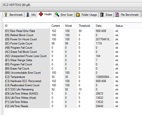 snaphat (Myles Landwehr) Member Posted November 21, 2013 Member Share Posted November 21, 2013 Your SSD is claiming it has 92% of it's usable life left if I'm reading the smart attribute correctly. I didn't bother to read the error rates because the meaning is inconsistent between HDD manufacturers. I would look it up if I were you though. I'm sure you can find something about how it works. Link to comment Share on other sites More sharing options...