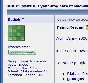 RadishTM Veteran Posted November 27, 2003 Veteran Share Posted November 27, 2003 [Keanu Reeves] :o Woah! :o [/Keanu Reeves] Well, it's my 8000th post & 2 year stay here at Neowin :woot: - Well it will be on the 28th :p .... It's been an awesome 2 years here at Neowin for me :yes:, and all the ups & downs of the site have made me love it even more :wub: :happy: .... Got some people I'd like to thank - Blaise - Being there for me at troubled times & being a super duper friend, thanks mate (Y) gameguy - For being the greatest MSN beta tester :laugh:, his choice of words over MSN & a cool friend :p Spyder - For being a good friend all round :) Cara - For being a decent friend :) FlishFun - For being an annoying contributor over MSN :shifty: but releasing the awesome AutoPatcher XP :woot: KoL, b0se & Krezno - For their excellent visual styles :happy: JohnsonBox - For his entertaining 'engrish' threads :laugh:, I hope it's all coming along well JB (Y) DaBeeeenster, digipoi, adonai - For their informative debates on issues around the world & loads of headbutting/flaming over minor things :whistle: And Neobond, Redmak & Voodoo - For keeping me on the Neowin Team & providing one of the best sites on the Web, thanks guys (Y) :happy: And many other cool members I can't think of right now :pinch:, but your remembered by me :) .... ROCK ON NEOWIN! :punk: .... Oh and if you don't like this thread, stay the **** out of it or be officially warned :) .... Radish? Link to comment Share on other sites More sharing options...