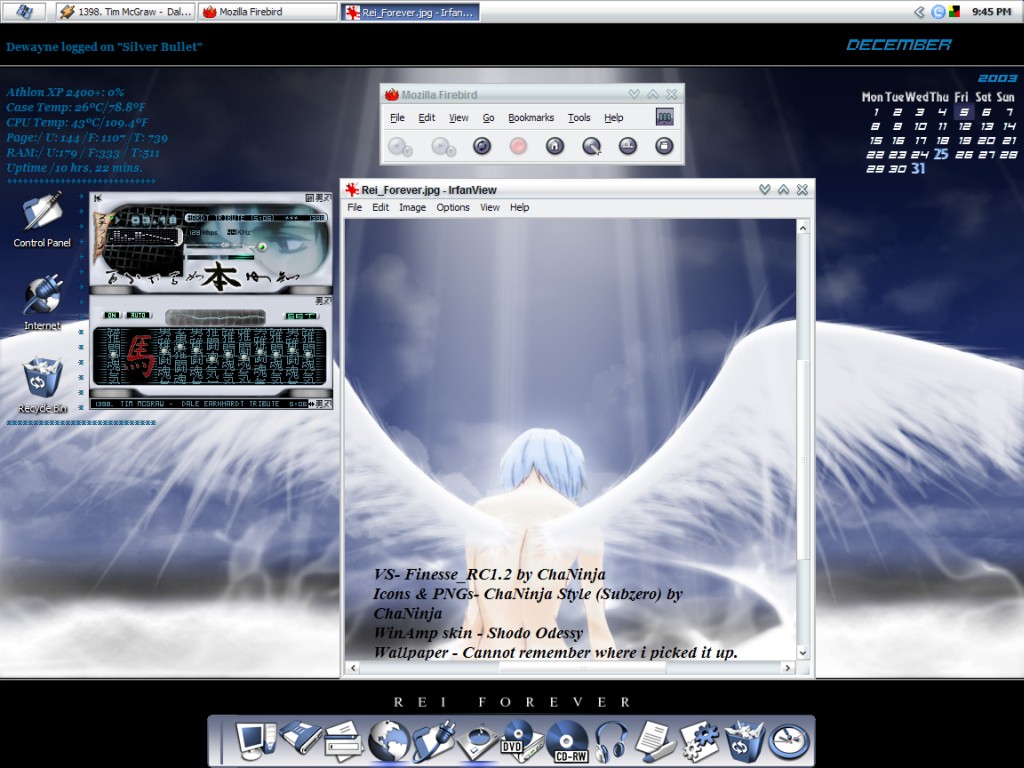 monofonik Posted December 6, 2003 Share Posted December 6, 2003 Wallpaper: Ditch by Mandolux Icons: G.A.N.T by Mattahan Visual Style: Velvet Waves by ThemeNorth Running: Miranda IM (w/ G.A.N.T icons), Foobar2000, Adobe Illustrator CS, DAEMON Tools Link to comment Share on other sites More sharing options...