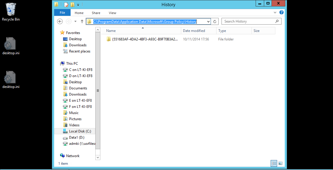 Praetor Posted November 11, 2014 Share Posted November 11, 2014 hmm. perhaps it's different in 2012 and 2008 R2 update: i can confirm that there is no "C:\ProgramData\Windows\Group Policy" anywhere. I've looked on a 2008 server, 2008 R2 and 2012. I cannot seem to find the location of the cached GPOs on servers... Also, we're currently trying the suggestion of the embedded OU right now. i'll report back. Eh, it's hidden. I just checked on a Server 2008, Server 2008 R2 and the above Server 2012 R2, it's in there. Link to comment Share on other sites More sharing options...