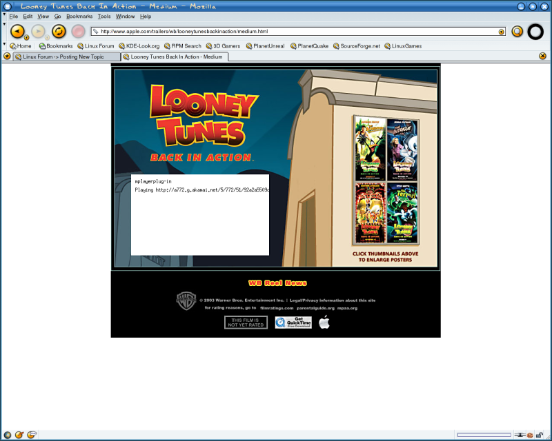 NeoMasamune Posted December 17, 2003 Share Posted December 17, 2003 I'm running Fedora Linux and Firebird. My biggest problem is that, even though I can watch quicktime movies that I've downloaded ( with MPlayer), I couldn't see them in Firebird - like I can in Windows. I was never able to find a plugin for it. :( I found this very annoying because I would have to download each movie by looking at the page source, skimming through all the code and finding the link. :crazy: Frustrated, I searched and searched and found the solution! A guy named SuseUX made this plugin for Mozilla. All you have to do is put it in your Firebird plugins folder, restart your browser and BAM! Instant Quicktime movies! :yes: I thought that I would share this with you all because I'm sure that I'm not the only Linux user that found this problem annoying. :D Edit: (I think you have to install MPlayer first for this to work) Link to comment Share on other sites More sharing options...