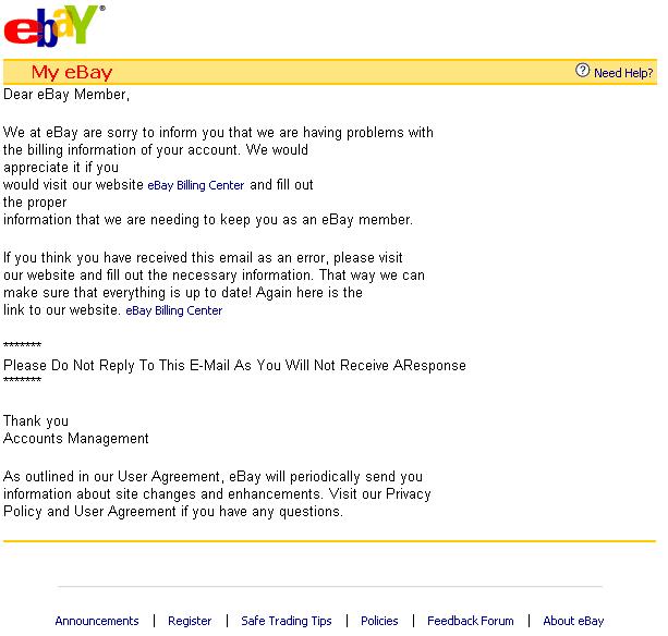 dreamz Veteran Posted December 20, 2003 Veteran Share Posted December 20, 2003 not sure if this is old, but i got an email from ebay claiming i needed to update my billing info and they requested my personal info like ssn, credit card numbers, etc. it looks like a real email from ebay, but the typo and the links look fake. just watch out. Link to comment Share on other sites More sharing options...